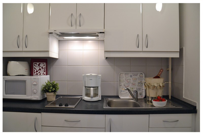 Az aparmnan a földszinten van. Van benne 2 hálószoba, nappali, konyha és fürdőszoba WC-vel bidével. A lakás belső kétszintes. A teljes terület 60 négyzetméter két emeleten. A bejárat, a nappali, a konyha és a fürdőszoba a földszinten található. Az emeleten van egy nagy hálószoba és egy kisebb hálószoba. Ezeknek a szobáknak közös ajtójuk van, így a két szoba egymásból nyílik. A lakásban lépcső van, ami kissé meredek, ezért ittasak időseknek és mozgáskorlátozottak számára nem ajánlott!