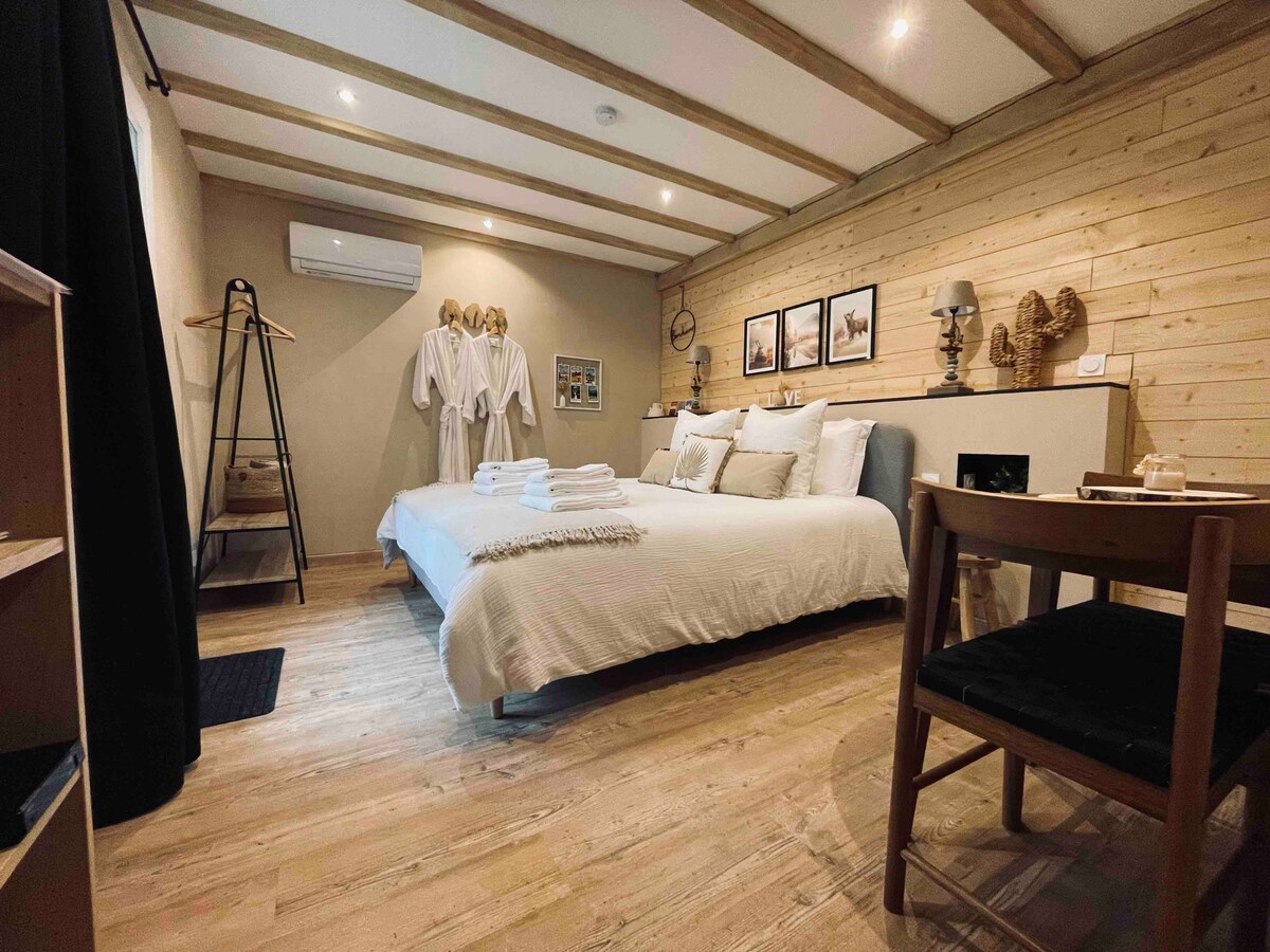 Venez profiter d'une expérience ressourçante au sein de la Grange du Père Émile, nouveau chalet de village, dernière née des Granges Deth Pouey. Vue absolument panoramique de toutes les pièces et du jardin clos, ainsi que du sauna et de la douche extérieure. Dépendance sécurisée pour les vélos et skis. Clim dans toutes les pièces. 2 chambres avec chacune sa sdb. Logement spacieux pour 4 personnes. Lit de camp d'aventurier pour un enfant (5p). Chargeur V.Elec. Prestations de très belle qualité.
