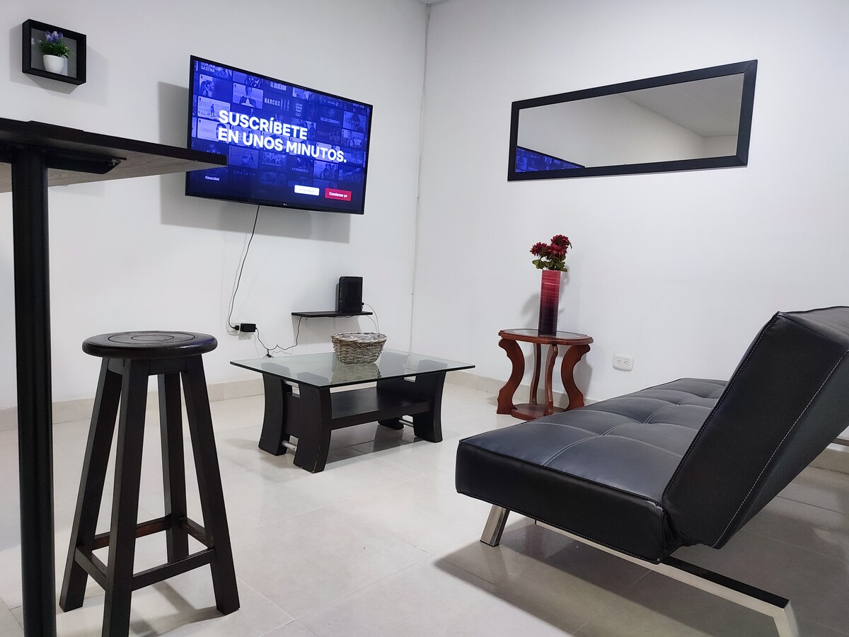 Modern és kényelmes lakás, felszerelt konyhával, légkondicionálóval és gyors Wi-Fi-vel. Biztonságos, csendes és központi tér, ideális pihenéshez vagy munkához Villavicencioban. Az ingatlanon belül van egy hely, ahol további költségek nélkül tárolhatók a motorkerékpárok. A kormány rendelete értelmében a vendégek kötelező regisztrációjához a személyazonosító okmány fényképét kérjük. A VIVA bevásárlóközpont kevesebb mint 1 km-re, az üzletek és gyógyszertárak pedig 2 háztömbnyire vannak. Gyors hozzáférés a közlekedéshez és a szolgáltatásokhoz, privát bejárat intelligens zárral