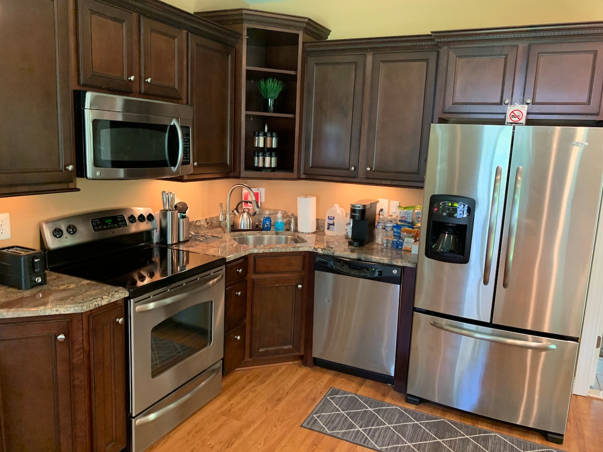 Take it easy at this unique and tranquil getaway. Keeping it simple and clean at this peaceful and centrally-located place. Cozy and placed in a beautiful quiet neighborhood. one bedroom Suite with its own bathroom and private side entrance provides a relaxing atmosphere for work or vacation. No shared spaces. No keys needed . it's a keyless secure entrance. There is no kitchen, however, the Suite includes fridge, microwave, keurig coffee machine with included coffee pods, cups and air fryer.
