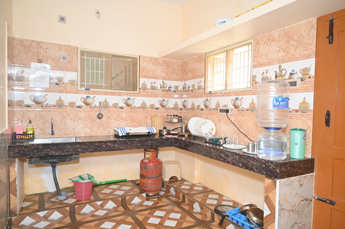 Relax with the whole family at this peaceful place to stay. Our villa is right next to the famous Vaithamanidhi Temple - just 2 minutes walk! You get the entire 2BHK house with AC, kitchen, WiFi, TV, and parking. Perfect for visiting the 9 Nava Tirupathi temples. We help with temple tours, car rental, and pickup. Cook your own food or we arrange meals. Up to 7 people can stay. Safe, clean, and great for pilgrims and families!
