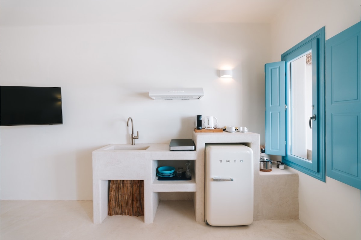 Ez az elegáns lakosztály az oiai kaldera szikláin található. A hagyományos kükládi építészetet minimális dekoratív stílussal ötvözi, így tökéletes választás azoknak, akik pihenni szeretnének. A lakosztály kb. 37 négyzetméter, saját szabadtéri barlang pezsgőfürdővel, amely magánéletet és lenyűgöző kilátást kínál a kalderára és a vulkánra. Az ár tartalmazza a reggelit. A szoba légkondicionálóval, ingyenes Wi-Fi-vel, kávé- és teafőzővel, fürdőszobai szolgáltatásokkal és intelligens TV-vel van felszerelve.