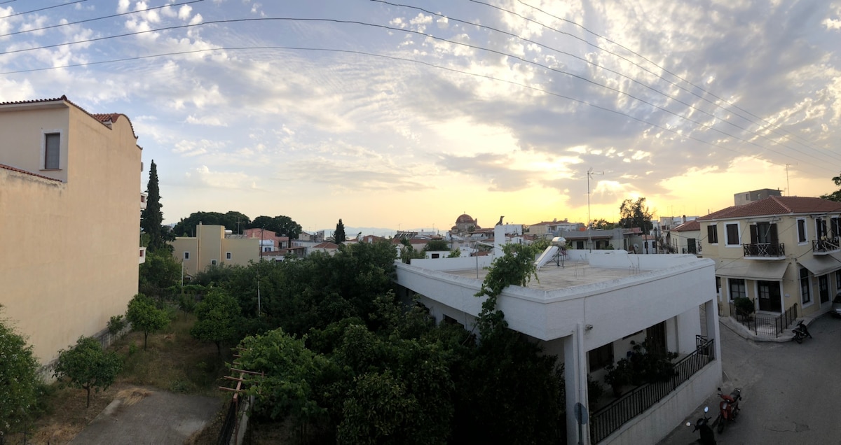 Vadonatúj lakás, egy hagyományos épület második emeletén, egy központi téren/kertben, Aegina város központjában. Csendes terület, de közel minden kávézóhoz, étteremhez, bárhoz, tengerparthoz, 20 méterre az Aegina kikötőtől. Csodálatos kilátás a tengerre és a naplementére.
