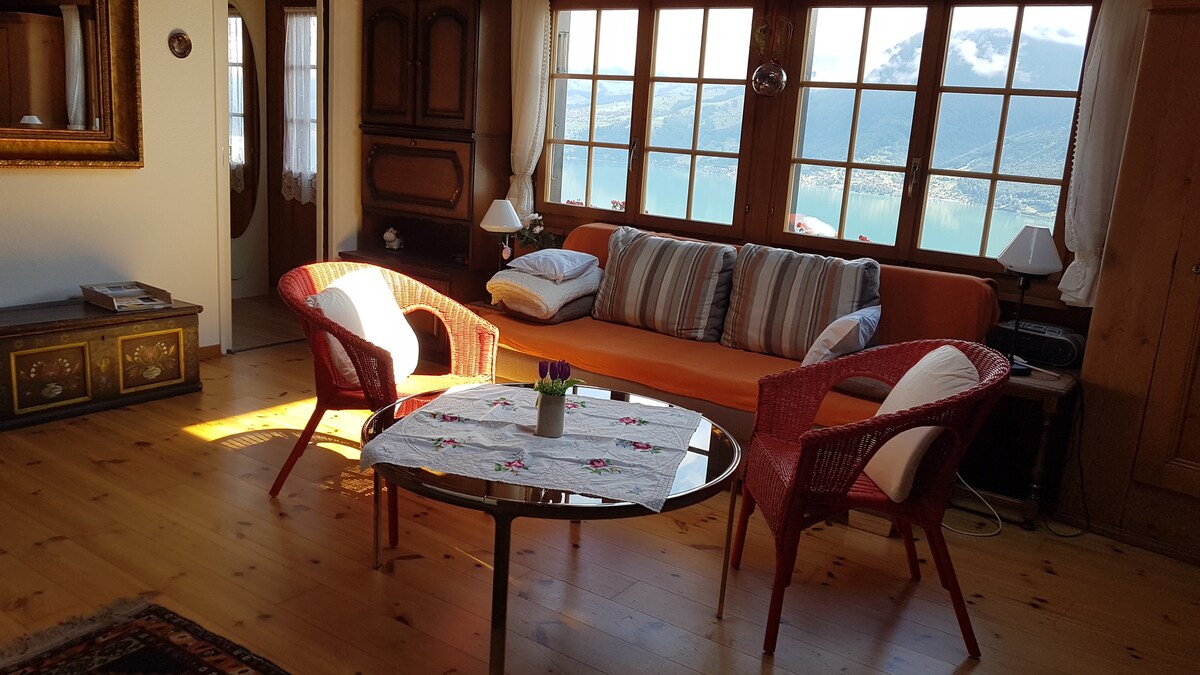 🛌 Nagyon nagy franciaágy 💻 Gyors Wi-Fi és munkaterület 🌄 Lélegzetelállító kilátás a hegyekre és a tóra + saját terasz 🎨 Hangulatos, átgondolt belső terek 🍳 Teljesen felszerelt konyha 🚗 Fenntartott parkolás 📺 Okostévé és szórakozás 🧺 Mosógép és szárítógép 🧳 Ingyenes poggyásztárolás ⏲️ Superhost-házigazda gyors, barátságos válaszokkal 🚗 Könnyen megközelíthető Brienz, Interlaken, Thun, Lauterbrunnen, kastélyok, túrák és a tó! ❗️Kérjük, olvassa el a teljes leírást, hogy reális elvárásokat alakítson ki.
