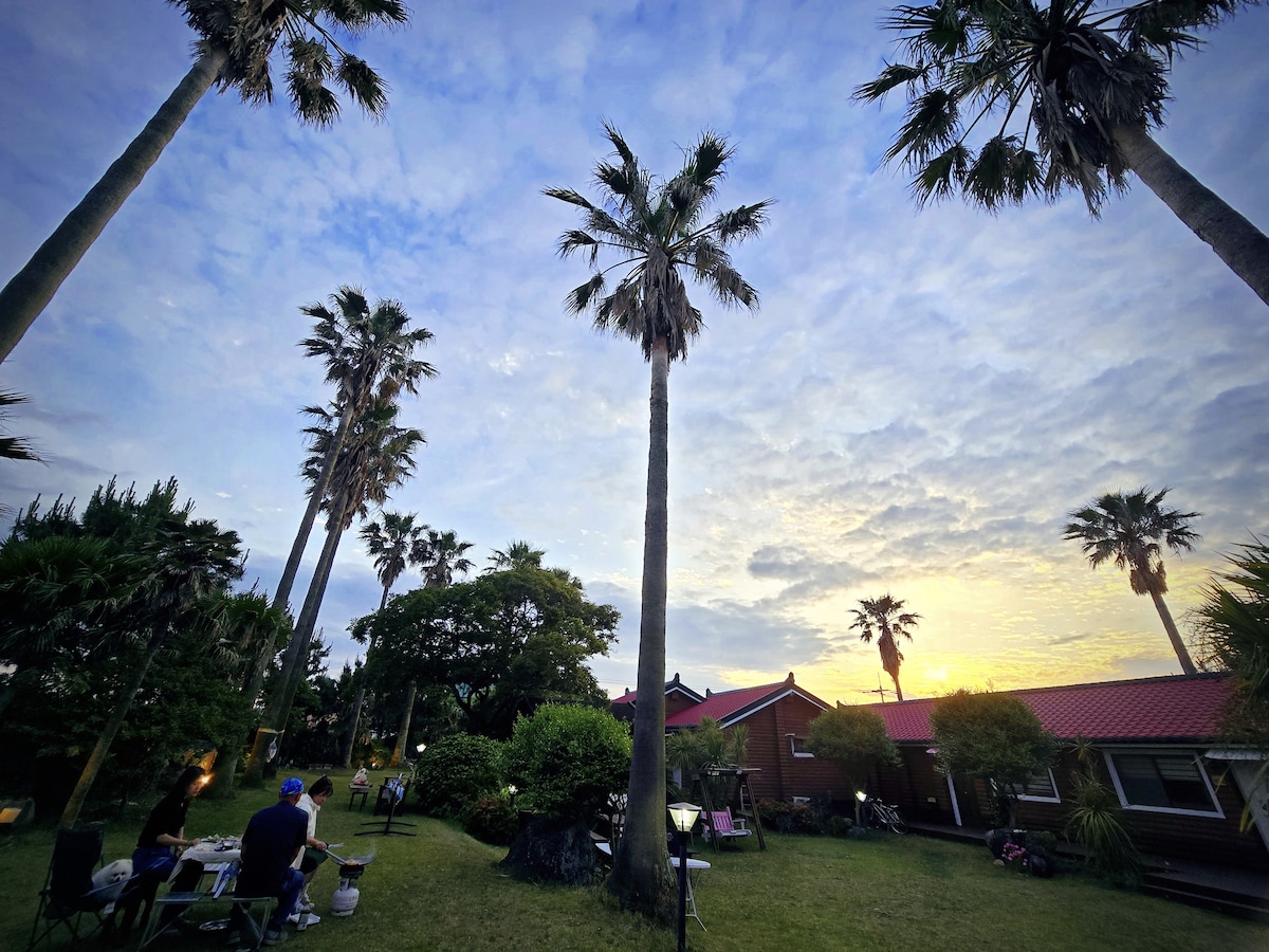 Csendes és gondoskodó paradicsom az erdőben, ahol elmenekülhetsz a mozgalmas mindennapi életből, és álmodozhatsz egy pillanatnyi gyógyulásról Maradj ezen a különleges helyen, és érezd a természet hangjait. A faszenes barbecue-t közvetlenül egy 10 000 pyeongos réten is megkóstolhatod a Csedzsu-sziget közepén, 400 méteres tengerszint feletti magasságban, így megkóstolhatod, élvezheted a nyugodt tűzrakóhelyet, és elmerülhetsz Csedzsu kék éjszakájában. Hozz létre felejthetetlen emlékeket, miközben Aewol Beach-et és Hallim Beach-et nézed a távolban Különösen hétköznapokon élvezheted a csendesebb és privátabb időt alacsonyabb áron.