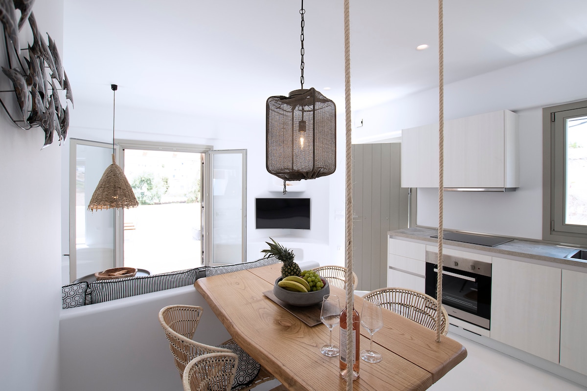 Kükládi stílusú apartman lenyűgöző kilát kilátással a tengerre és a naplementére