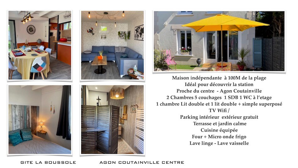 A „ házzal szemben ” lévő „ tengerparti ” hangulatot áraszt a régi, felújított bájától, a modern felszerelések kényelmétől. 6 km-re Agon Coutainville homokos strandjától (10 perc autóval/ 20 perc biciklivel), és számos turisztikai helyszín veszi körül: kastélyok, apátságok, leszálló strandok, Mont Saint Michel stb., ideális hely egy pár vagy családi nyaraláshoz. A ház zárt kerttel és egy nagy, déli fekvésű terasszal rendelkezik.