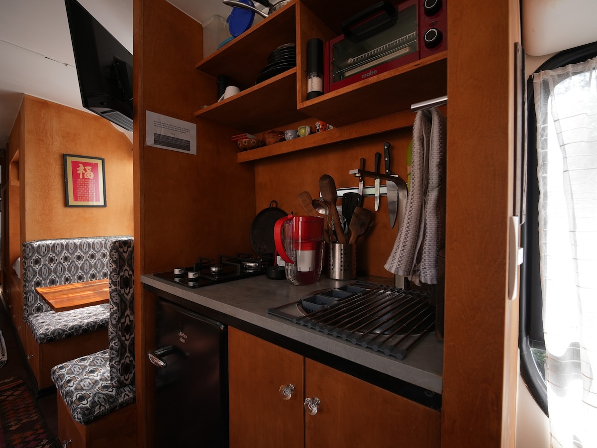 Élvezd az egyedi élményt egy teljesen felszerelt, felújított buszon. Luxus és kényelem az erdőben. Van egy hálószobája queen méretű ággyal és egy különálló kabinja. Erdő veszi körül, amit egy csodálatos teraszról nézhetsz. Felejthetetlen élményben lehet részed teakonyhával, grillezővel és tábortűzzel felszerelt kültéri konyhával. 5 percre Huasca belvárosától, egy kis Pueblo Mágicótól. 1 autó számára van parkolóhely. Megbeszélhetjük az érkezésedet egy megbízható sofőrrel.