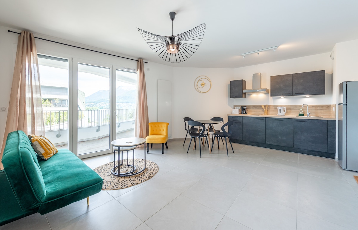 „La Scène du Lac” – Két szoba terasszal és garázzsal 4 fő részére A vadonatúj Annecy Tresum negyed szívében – L'Avant-Scène, tervezte Christian de Portzamparc. Közel a tóhoz és Annecy óvárosához. Képzeld el magad, kényelmesen berendezkedve egy tágas, 52 m2-es teraszos lakás hangulatos légkörében, amely 2-4 fő elszállásolására alkalmas.