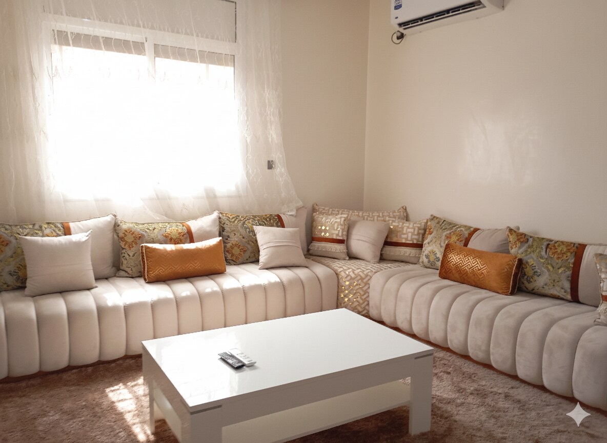 Stílusos és tágas lakás Béni Mellalban, ideális helyen, biztonságos és csendes környéken. Ez a 100 m2-es otthon 2 hálószobával, 2 modern fürdőszobával, teljesen felszerelt konyhával és egy nagy nappalival rendelkezik, amely TV-vel és száloptikás Wi-Fi-vel rendelkezik. A Carrefour és a Marrakech felé vezető út közelében élvezheted a nyugalmat, miközben könnyen hozzáférhetsz a helyi kényelmi szolgáltatásokhoz. Nagyszerű a kellemes és kényelmes tartózkodáshoz.