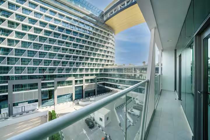 Our thoughtfully designed Studio Apartment is located in the heart of Dubai's Palm Jumeirah, just opposite the famous Nakheel Mall. The studio apartment has a fully equipped kitchen and is situated within a fully-serviced 5-Star lifestyle hotel, the Andaz Dubai The Palm by Hyatt. The apartment provides you with access to a range of amenities, such as an adults-only pool area on the rooftop of the building, as well as access to the community's beach and family pool overlooking Burj Al Arab.
