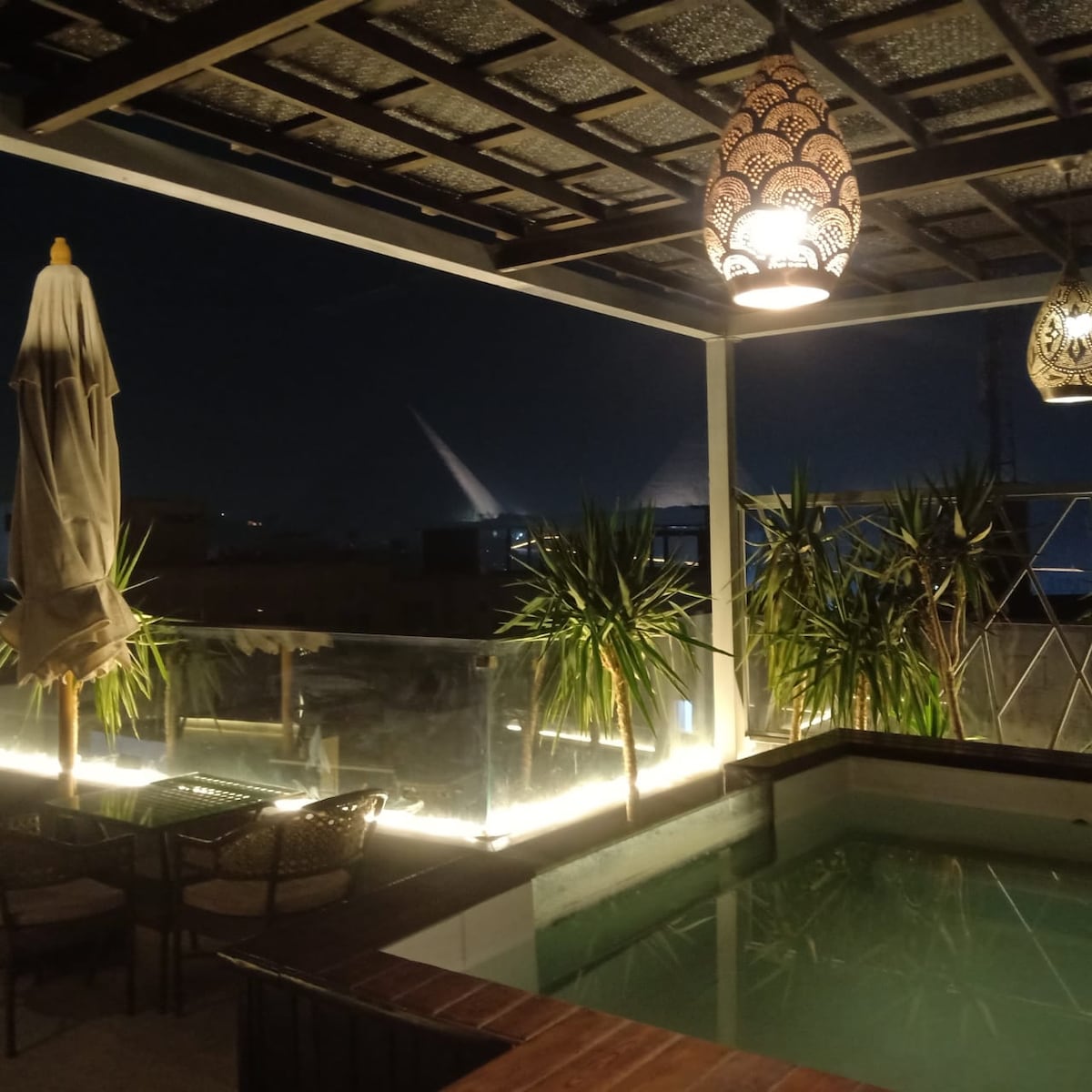 Menekülj egy egyedi művészi menedékhelyre, ahol a természet és a dizájn tökéletes harmóniában egyesül. Ez a kézműves stúdió, amely mindössze 5 perces sétára található a gízai piramisoktól, magával ragadó élményt nyújt természetes anyagokkal, egyedi, kézzel készített bútorokkal és lélegzetelállító kilátással a piramisokra közvetlenül a privát jacuzzidból.