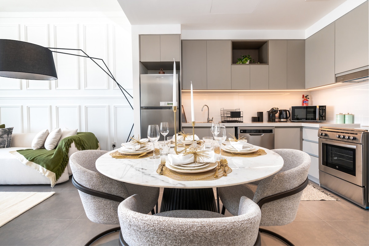 Kick back and relax in this calm, stylish space, this lavish Parisian style apartment features a large living room with an open kitchen, a luxurious dining area and a cozy balcony to share with your family and friends, a master bedroom with a king size bed and ensuite bathroom, a second bedroom with 2 single beds with an option to assemble together, a well-equipped kitchen to prepare your favorite delicious foods, a free access to modern amenities including GYM, SWIMING POOL & KIDS PLAY AREA.