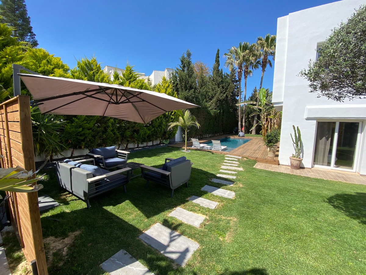 Hangulatos 390 $ villa 500 $ lélegzetelállító kerttel és egy 12/4 méteres medencével. Két szülői lakosztálya van, két két kétszemélyes hálószobával, négy fürdőszobával, egy konyhával és egy garázssal. A villa a Yasmine Hammamet városrészen található Le Royal Hotel and Spa rezidencia része, amely nagyon biztonságos terület. A tengerpart 5 perc sétára található. Csendes és biztonságos, közel a boltok és éttermek.A villa teljesen légkondicionált. Amit kínálunk: kávéfőző, wifi, Netflix, babaágy, grill,mosógép…