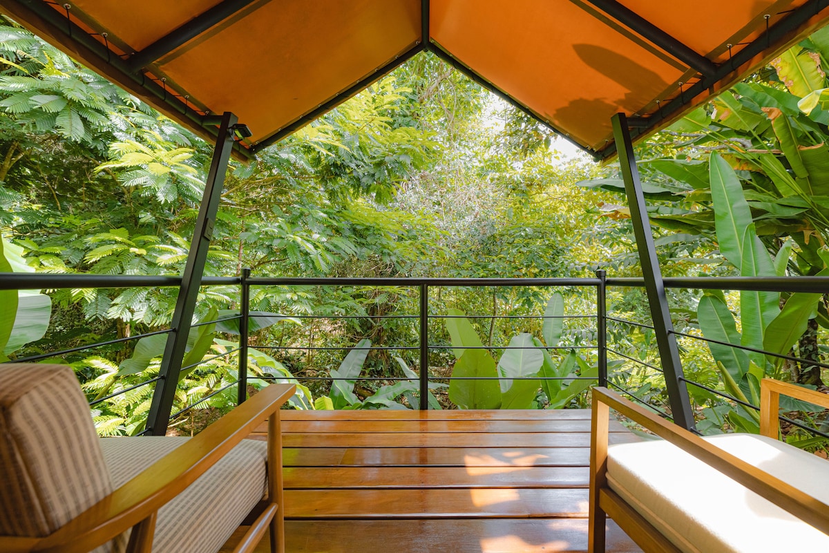 A 16' x 34' méretű glamping sátrak teljesen berendezettek, és egy egzotikus esőerdőben találhatók a Tenorio vulkán mellett. Minden Glamping sátorban két queen-size ágy és egy queen-size felfújható matrac található, ahonnan csodálatos kilátás nyílik a fák tetejéről. Minden Glamping sátorhoz tartozik egy csatlakoztatott, külső, zárható vécé, 2 szabadtéri zuhanyzó rövid sétára a sátortól. A glamping sátrak étkezőasztallal és székekkel, ruhásszekrényrel, mikrohullámú sütővel, hűtőszekrénnyel és készülékekkel vannak berendezve a főzés örömére