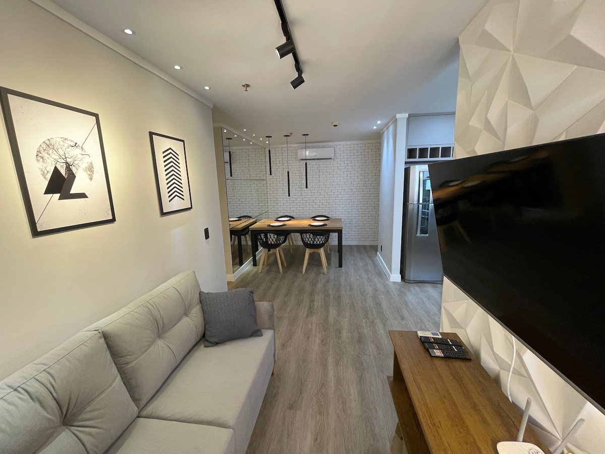 Apto 45 m2. Quarto:Cama Queen,armários,bancada escritório,TV 4K 50”,ar-cond.,roupa de cama/banho. Sala: sofá cama,TV 4K 50”,ar-cond.,mesa e 4 cadeiras design italiano. Cozinha:armários,bancada,cooktop 4 bocas,geladeira,forno elétrico,forno microonda,cafeteira elétrica,filtro água,sanduicheira, panelas,utensílios. Piscina borda infinita, hidro,sauna,academia,brinquedoteca,salão festa,espaços gourmet. 1 vaga garagem. Portaria 24 horas porteiro e segurança. Temos outro apto