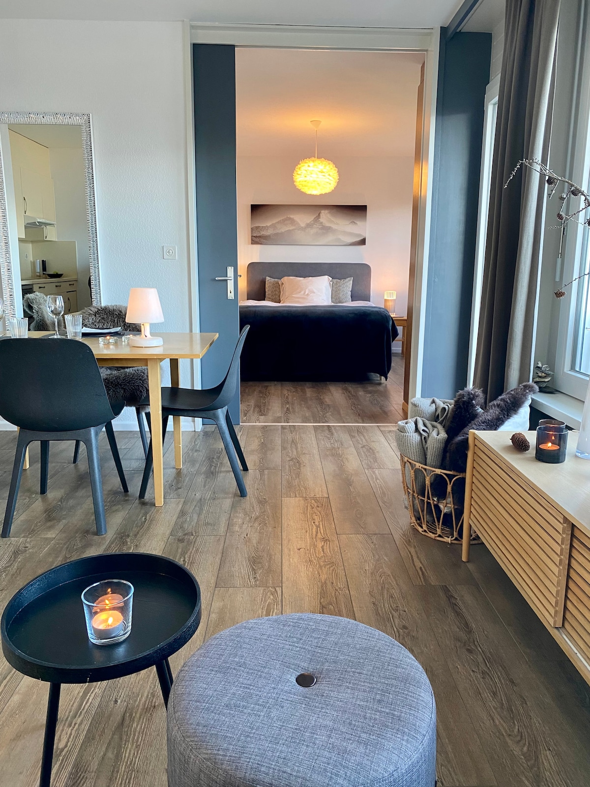 Our completely renovated apartment, on the top floor with a magnificent view, is located in the beautiful alpine village of Leukerbad. It is very suitable for 4-5 people. With the pull-out sofa, the apartment can also accommodate 7 people (but we find it a little cramped with 7). A parking lot is available free of charge. The distance to the bus stop is 1min, to the next bakery 5min and the ski valley run ends 6min walking distance (ski-in)