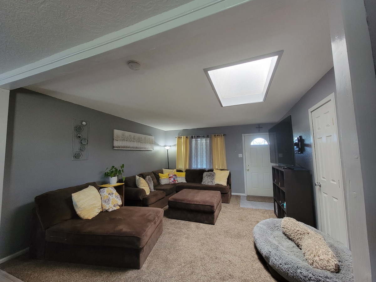 A NE Heightsban található nemrég felújított otthon egy általános iskolával szemben található, öt percre az I-40-től és 10 perces autóútra a Kirtland Airforce Base-től. Felszerelt konyha 3 bútorozott hálószobával és egy irodával. Nagy hátsó udvar grillezővel - tökéletes háziállatok és gyerekek számára! A nappaliban 55' síkképernyős TV, szekcionált kanapé és elektromos kandalló található. Dohányzás CSAK A SZABADBAN engedélyezett, háziállat frindly, 2 szabad parkolóhely a helyszínen, nagy sebességű internet. Garázshoz nincs hozzáférés.