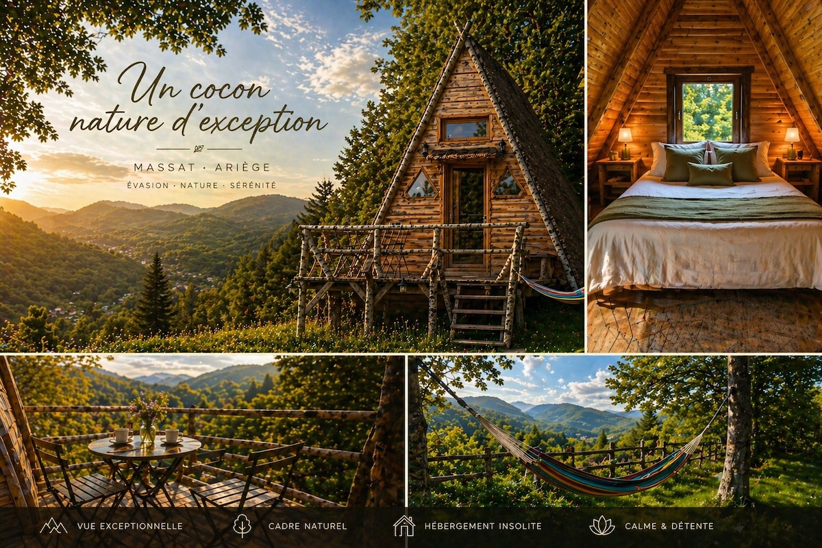 Cocon „Le Mirabat” Ideális báb egy romantikus hétvégére, kis konyha az ételek elkészítéséhez és hangulatos fürdőszoba. A létrán megközelíthető magasított ágy különleges bájt kölcsönöz a helynek. A létra kicsi, és a keskeny bejárat a tető alatti ággyal biztosítja a víkendház hatását. Chalet type Kota. Egy rövid sétára a főépülettől független vagy. A közös társalgóban wifi is elérhető. Tökéletes néhány napra a zöldövezetben...