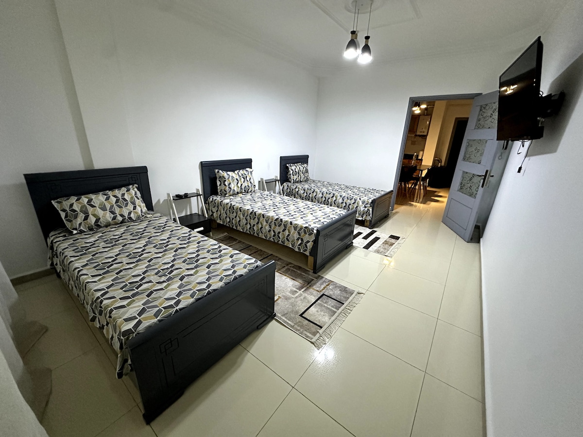F3 of 66 m2 all comfort, quiet and bright, fully renovated with wooden parkquet flooring. Atipikus és kézműves dekoráció. A következőkből áll: • Nappali teljes konyhával • Nappali (sarokkanapé tévével) • 2 hálószoba (franciaágy és többszintes ágy, egyszemélyes ágy és esernyőágy) • 2 légkondicionáló • WiFi, H24 víz és háztartási ágynemű Egy modern „Ryad city III” rezidencián, biztonságos bejárattal (jelvény, kamera és gondnok), 5. emelet lifttel, mecset a rezidencia alján