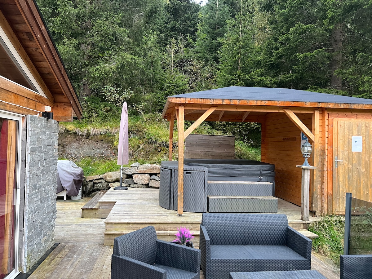 Koselig hytte med overbygd jacuzzi og fjellutsikt.