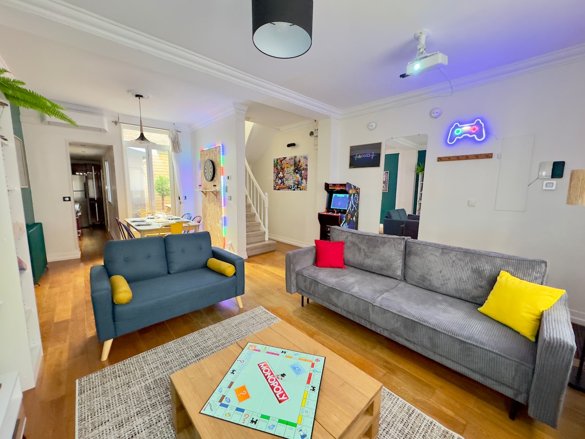 Fedezze fel ezt az atipikus és kényelmes házat, amelyet 6-8 fő számára terveztek Amiens történelmi negyedében, néhány perc sétára minden kényelmi szolgáltatástól. Elmerülhetsz Jules Verne és kalandjainak világában. Számos szolgáltatást találsz, mint például egy nagy balneo fürdőkád, szauna, mozi, óriás labdamedence és egyéb meglepetések, amelyeket felfedezhetsz a családdal, párokkal vagy barátokkal!