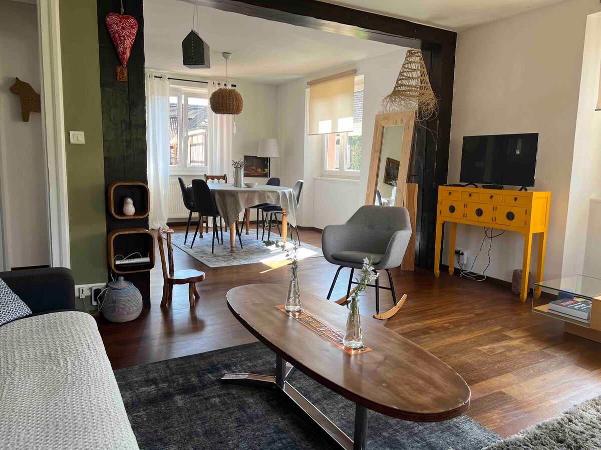 Teljesen felújított lakás családi házban Kaysersbergben, amely Franciaország legszebb faluja. Teljesen felszerelt konyha (nespresso gép) Nappali sarok bőrkanapéval és meridian, 1 hálószoba (ágy: szélesség 160). Tágas fürdőszoba zuhanyzóval és WC-vel. Nagyon csendes. Saját bejárat, ingyenes parkolás a ház előtt. szabadtéri tér kerti bútorokkal és grillezővel, elkerítve. Ágynemű, törölköző, WC-papír, szappan és tusfürdő biztosított.