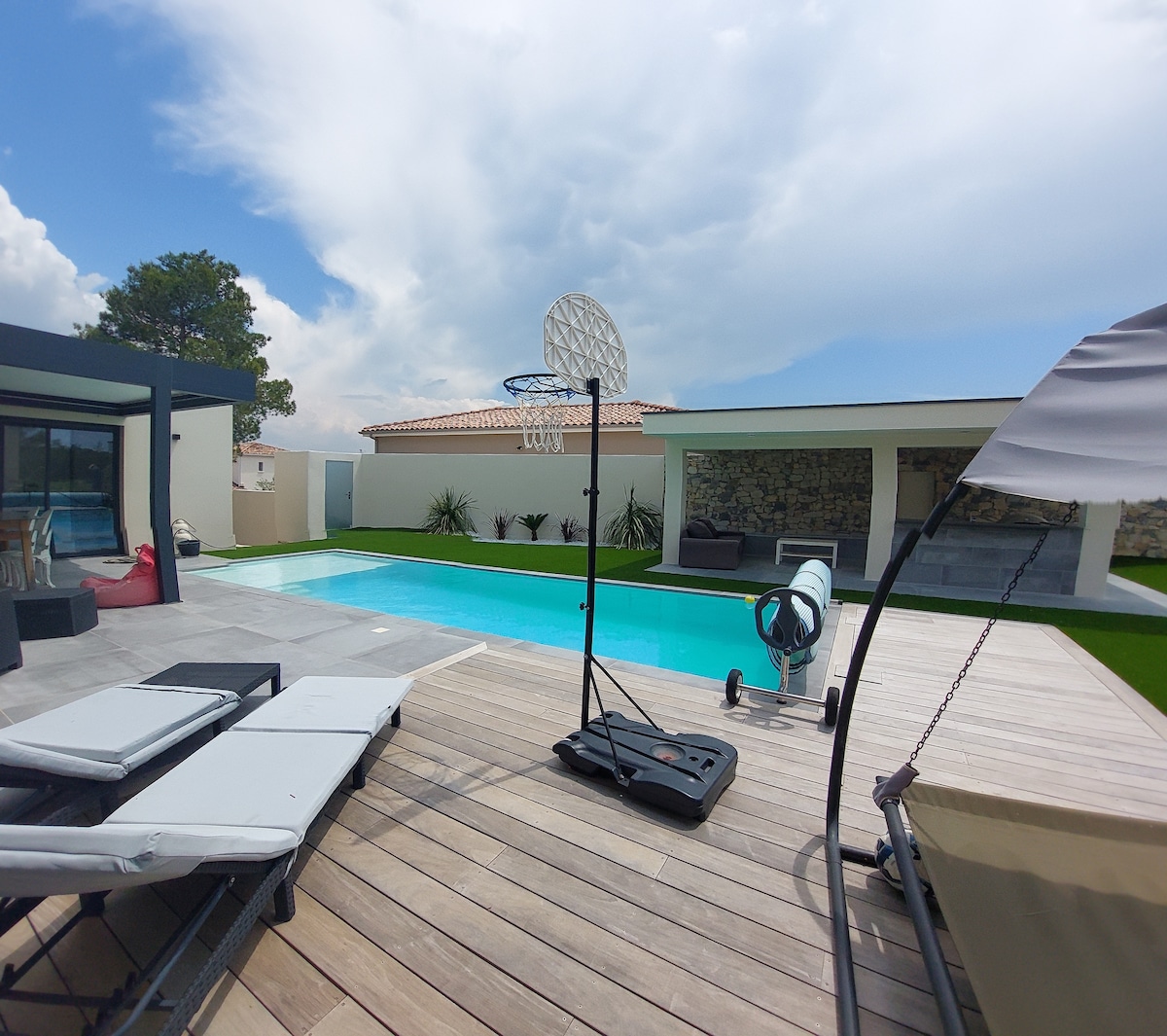 Gyönyörű új sorvillás villa, ideális helyen. Csendes lakónegyed. VEZETŐ: - 20 percre a tengertől - szupermarket 200 méterre - közel a vasútállomáshoz (10 percre Nîmes-től, 20 percre Montpellier-től) - autópálya bejárat 5 percre - túrázás vagy hegyi kerékpározás HIRDETÉS: - új, 85 m2-es ház, 6 fő részére - nagy terasz medencével - ágynemű és törülköző biztosítva - szabadtéri darts játék + pingpongasztal Tevékenységek: - közel Nîmes-hez és Montpellier-hez – számos sporttevékenység