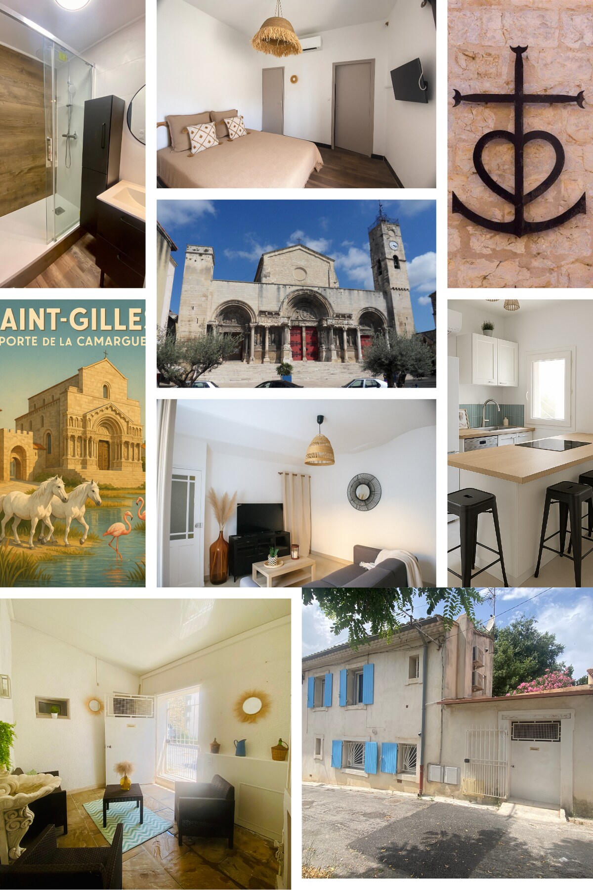 A Camargue természetes parkjának ajtajánál, Nimes és Arles római városai között, az Aigues-Mortes, a Le Grau du Roi és a Les Saintes Maries de la Mer közelében található, teljesen felújított ház Saint-Gilles város történelmi központjában, az alagsorban pedig zárt garázs található. Üzletek és kényelmi szolgáltatások közelében. WiFi és légkondicionáló. Éjszakai oldal: Egy hálószoba queen méretű ággyal és egy kanapéágy. A közelben : séta a természetben, gazdag kulturális örökség, hagyományos bulik, strandok és folyó...