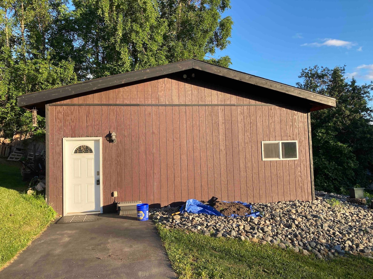 Apartment with separate entrance and private driveway from main house. You'll especially love having your own laundry, office space with height adjusting desk and dedicated WiFi. Enjoy the quiet, safe neighborhood, beautiful trees, and nearby mountains and trails. Located a quick drive to Providence/UAA. Regional Hospital and JBER Base 7-10minute drive. Wooded trails and creek, Tikahtnu shopping mall, Nordic Spa at Alaska Club close by and a short walk to tennis courts and playground.