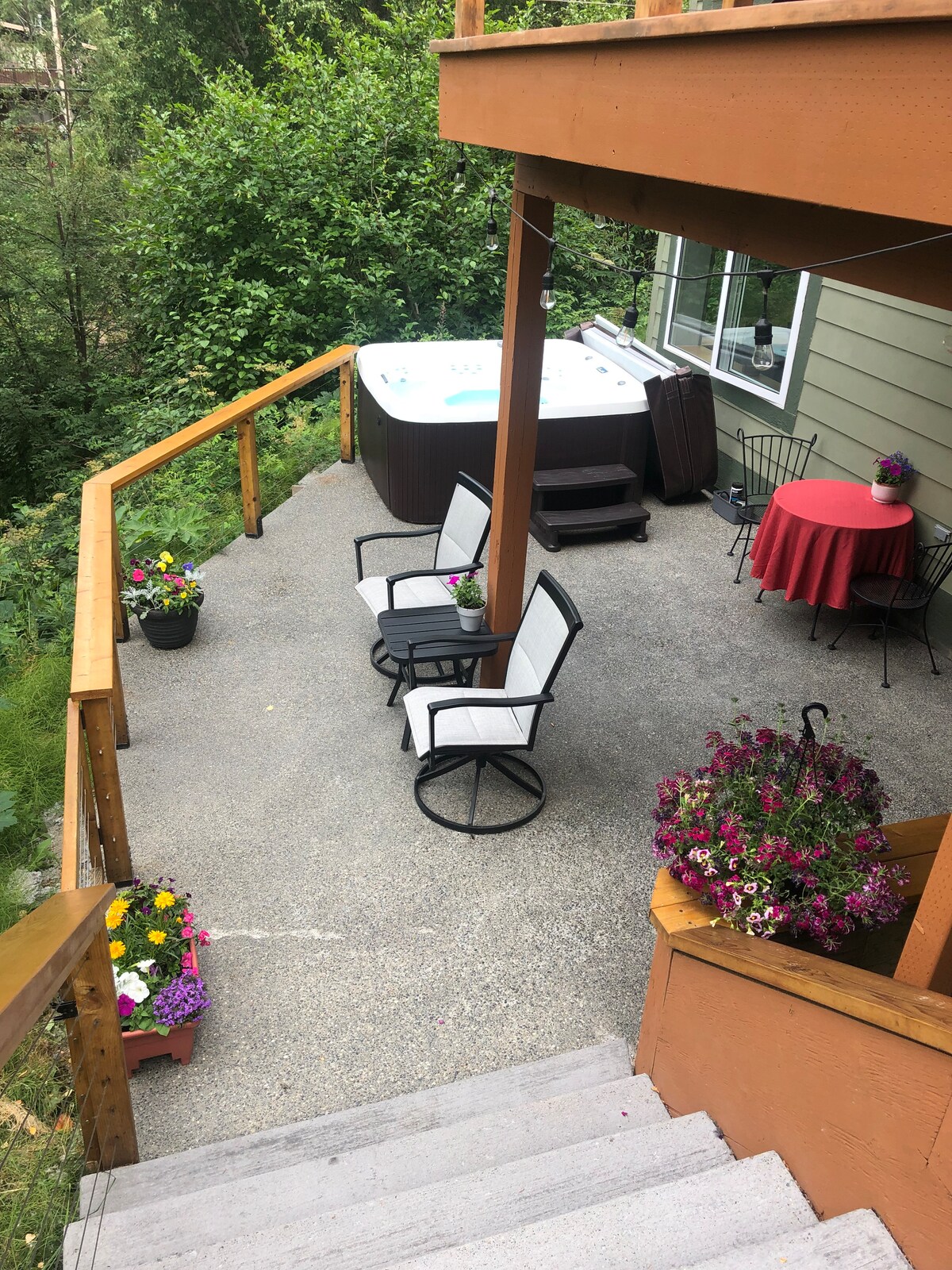 A Jewel Lake Home alsó szintje külön bejárattal és szórakoztató hátsó udvarral. Ez egy közelmúltbeli átalakítás; eklektikus tér vintage fa mennyezettel és ipari+ modern részletek keverékével. 5 percre vagyunk a repülőtértől, és a vendégek közvetlenül erről a helyről élvezhetik az alaszkai vadont. Közvetlenül a házunk mögött erdős ösvényrendszer található, ahol sétálhatsz és kerékpározhatsz. A vendégek tojást gyűjthetnek a csirkáinktól, használhatják az erdő melletti pezsgőfürdőnket, tüzet gyújthatnak a tűzrakóhelyen, vagy használhatják az eveződeszkákat a Sand Lake-en.