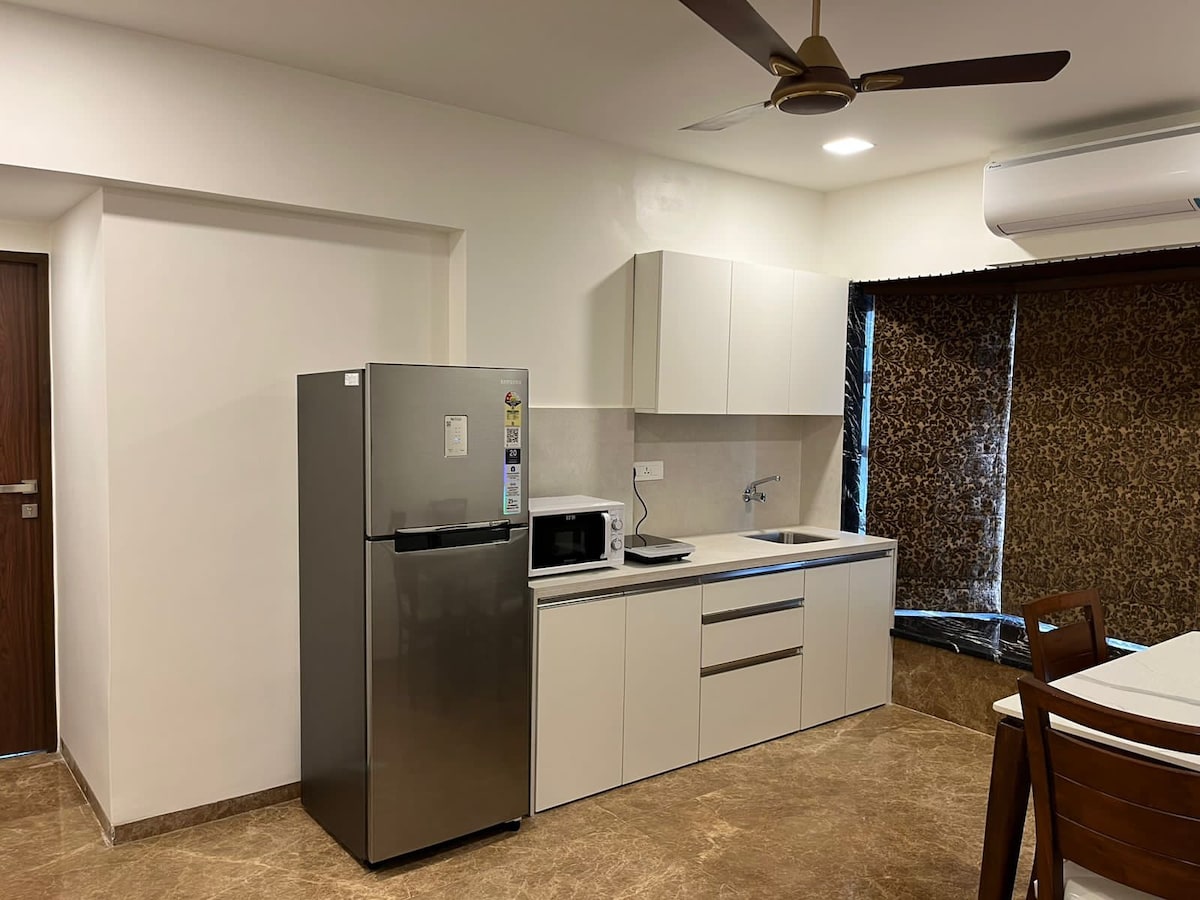 Központi elhelyezkedésű 1 Bhk lakás Goregaon West Mumbaiban, közvetlenül az ajtólépcsőn található metróállomással. A közeli helyek közé tartozik a NESCO Centre, az Infinity Mall Inorbit Mall és a Lokhandwala. Mindössze 10 km-re a nemzetközi repülőtértől, kiváló keleti és nyugati összeköttetéssel. Elegánsan berendezett, barátságos hangulatú, és minden kényelmi szolgáltatást biztosít a hosszú és kényelmes tartózkodás érdekében. Családoknak, vállalatoknak és ropogós üzleti utazóknak a legalkalmasabb. Teljesen felszerelt konyha opcionális házi segítséggel az otthon elkészített ételekhez és a takarításhoz.