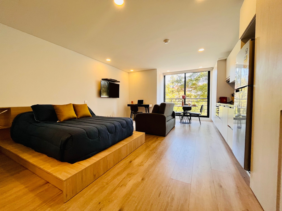 Disfruta de un moderno loft en una de las zonas más exclusivas de Bogotá. Ubicado estratégicamente a pocas cuadras de la Zona T, Zona G, y los principales centros comerciales como Andino, Atlantis y El Retiro, así como de la clínica del Country, este loft te sitúa cerca del centro financiero y de los mejores restaurantes, bares y sitios de entretenimiento de la ciudad. Ideal para estadías largas o viajes de trabajo y turismo. El edificio cuenta con un café-restaurante, co-working y terraza.