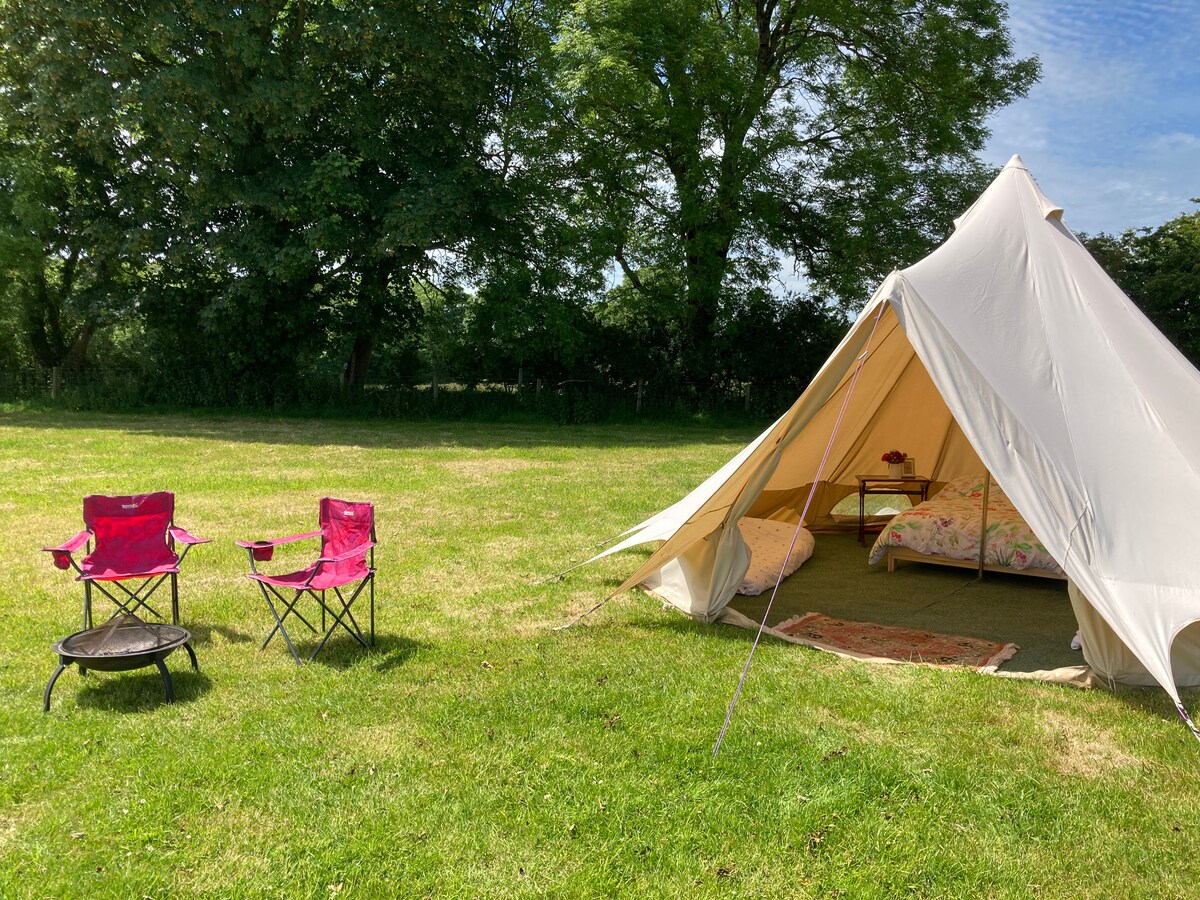 Bell Tent Glamping set in a lovely, peaceful location. Tökéletes két felnőtt vagy legfeljebb két felnőtt és két gyermek számára A környék közvetlen közelében található, ahol jobban eltöltheted a glamping-nyaralásodat. Van egy zuhanyzó/WC és konyha (közös hűtőszekrény, fagyasztó, vízforraló, mikrohullámú sütő, légsütő), amelyet megosztunk a kis lakókocsiparkunkkal. Mindkét sátorban van ágynemű, ágy alatti tároló, kempingszékek, edények, fazekak/serpenyők, evőeszközök, rönkök, chimenea, tűzgyújtók, elektromos takaró, elektromos fűtés/ventilátor.