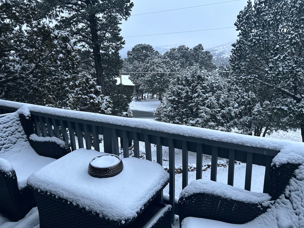 Gyönyörű, 2 emeletes, 2 ágyas, 2 fürdőszobás víkendházból CSODÁLATOS, akadálymentes kilátás nyílik a Sierra Blanca-hegyre, és magasan fekszik a fenyők között egy vonzó környéken. Két queen méretű hálószoba, teljes konyha, gyönyörű, hatékony kandalló, fűtés és hűtés, nagy ablakok a hegyekre néző búvóhelyről. Wifi, TV DVD-lejátszóval és Roku az emeleten, és kisebb Roku TV a földszinten. **A 2024. júniusi tűzvész óta a víkendház sértetlen - tekintsd meg az „Új tájkép 2024 júniusa után” című frissített képet **