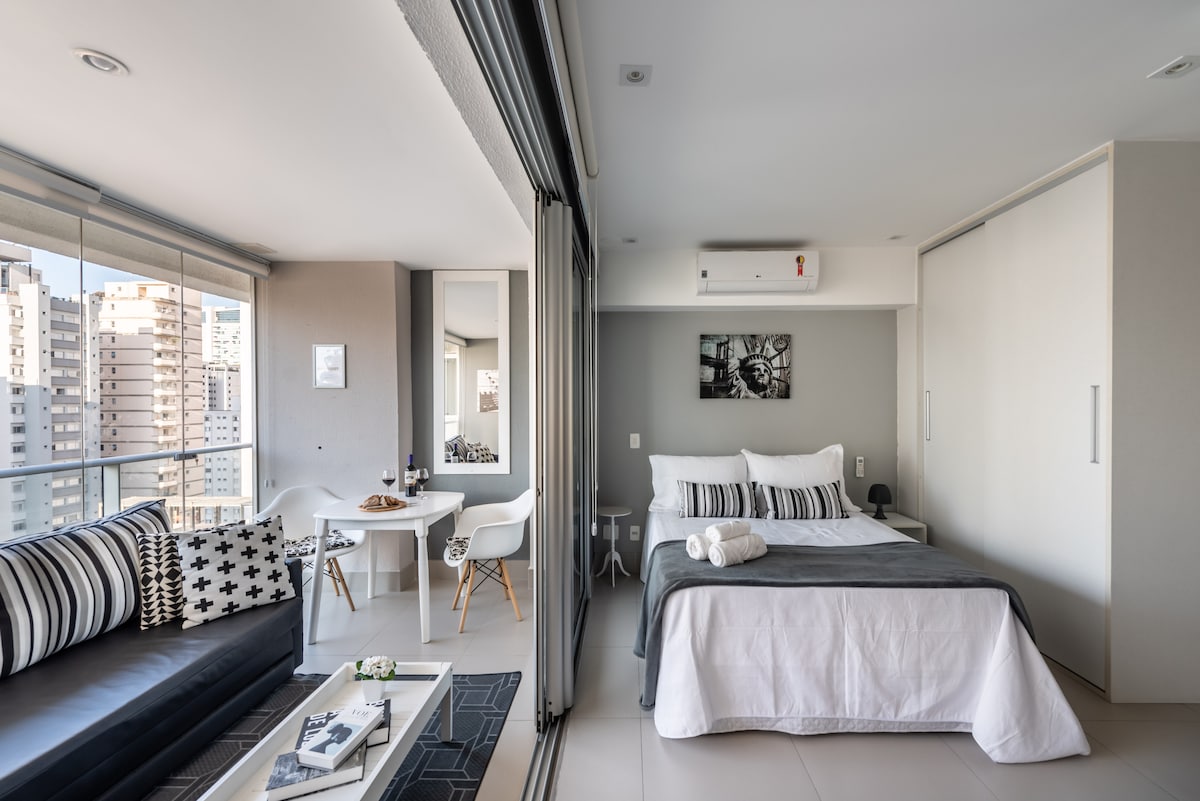 Located in the cultural center of the city, with museums, cinemas and shops, this brand-new studio is just two blocks away from Rua Augusta, and a few minutes from Av. Paulista, the best nightlife and gastronomic region of São Paulo. Fast and reliable Wi-Fi. Easy access, 5 min. walk from Paulista, Consolação and Higienópolis/Mackenzie subway stations. The building has a complete 24-hour gym and laundry facilities. Free parking for 1 car. 100" movie screen w/ Netflix and Prime Video.