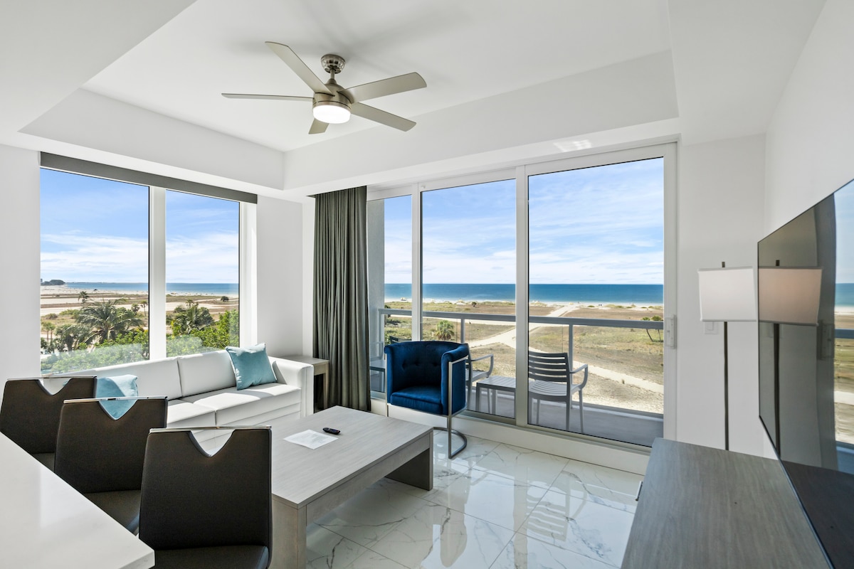 Ez egy nemrég felújított nászutas lakosztály, amely közvetlenül a Siesta Key nagy végével szemben található. Elegáns földszinti medenceegység. Ez az egység márvány munkalapokkal, tigrisszemekkel, lapis lazuli asztalokkal, pék nélküli mennyezeti ventilátorral, alabástrom világítással és óriási TV-kkel van felszerelve. Minden készülék rozsdamentes/okos, és a mikrohullámú sütő steakeket tud főzni. Van egy edzőterem. A kulcs földrajzi elhelyezkedését nem lehet felülmúlni! Van egy lebegő televízió a California King luxus memóriahabos ágya felett.