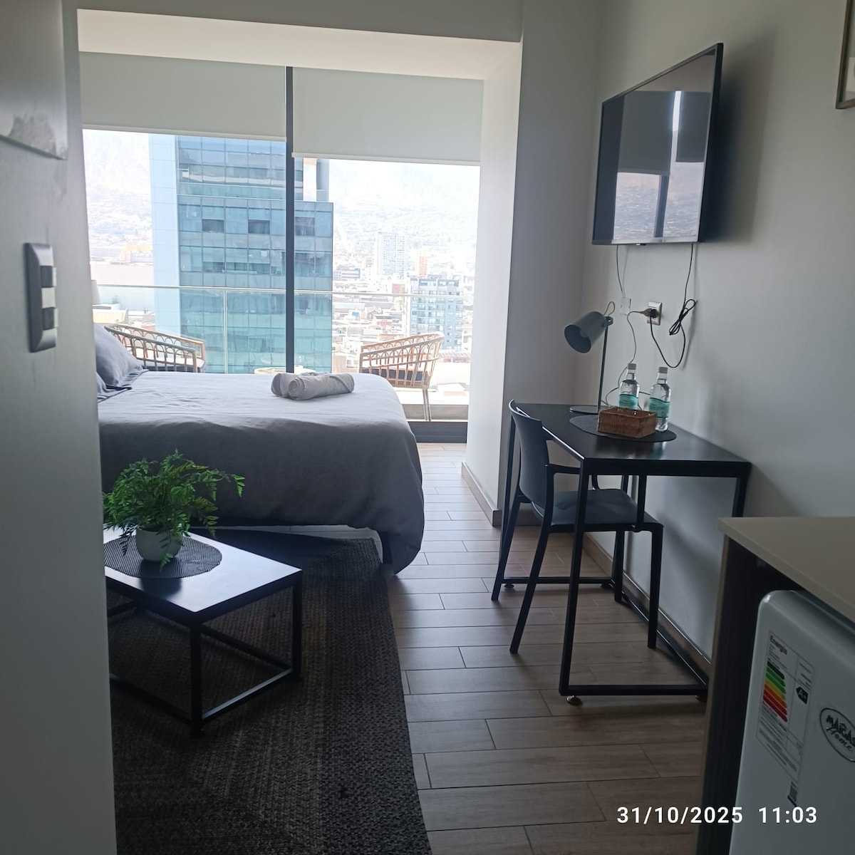 Stúdióapartman Antofagasta legjobb területén, a bevásárlóközpont egyik oldalán. A 18. emeleten található, ahonnan kiváló kilátás nyílik a városra. Apartman kiváló felszereléssel mindenhez, amire a vállalati utazóknak szükségük van: - Ágynemű és törölközők a használatodhoz. - Van internetkapcsolat. -Mesa spacious dining room. -Frigobar - Smart TV 26" - Főzőfelszerelés szükséges. - Felszerelt, teljes terasz, ahonnan a legjobb kilátás nyílik Puerto Nuevóra.