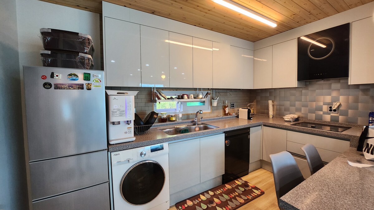 바다를 바라보며 가족,친구들이 아늑하고 행복한 시간을 보낼 수 있는 깨끗하고 넓은 숙소입니다. [숙소 구조 설명] 숙소는 엘리베이터가 있는 건물 3층에 위치하고 있으며 퀸사이즈 침대가 있는 침대방 2개, 퀸사이즈 침구세트가 준비되어 있는 온돌방 1개가 있습니다. 욕실은 총 2개가 있으며 1개는 3층에 다른 1개는 복층 계단을 올라가면 있습니다. 루프탑까지는 내부계단으로 이동하고 다락방을 지나면 멋진 바다를 볼 수 있는 루프탑이 나옵니다.