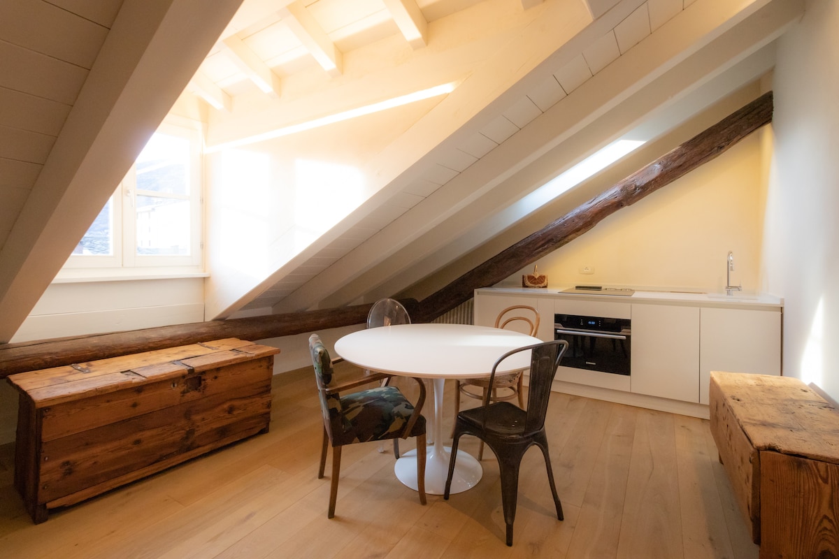 Appartamento molto bello e pulito, con vista sui tetti e sulle montagne. L'arredamento è un mix di storico e nuovo. Letto comodo, bel bagno e angolo cottura ben attrezzato. Posto in pieno centro con splendidi ristoranti e caffetterie a portata di mano rimane comunque silenzioso perché si affaccia su corte interna. Volendo si può riservare a parte un box auto che dista circa 5-10 minuti a piedi dall'appartamento sempre comunque in centro.