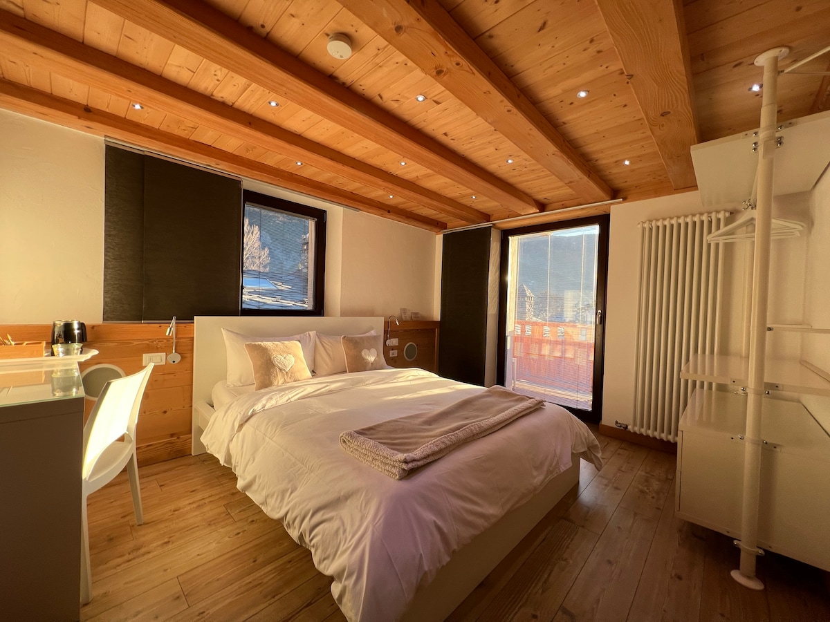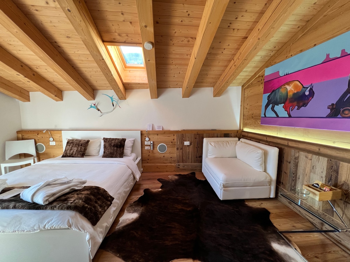 Camera matrimoniale in legno di abete naturale con bagno privato e balcone affacciato sulle montagne, bollitore con caffè té e tisane, Wi-Fi gratuito, impianto audio stereo. Il prezzo indicato è per il solo pernottamento colazione esclusa. Ottieni il prezzo più conveniente per la camera colazione inclusa chiedendo direttamente alla struttura.