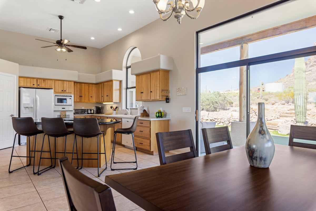 Üdvözlünk az arizonai Gold Canyonban található gyönyörű otthonunkban! Ez a lenyűgöző ingatlan saját medencével és mindennel rendelkezik, amire egy felejthetetlen nyaraláshoz szükséged lehet. Ahogy belépsz, egy tágas és gyönyörűen berendezett nappali fogad, amely tökéletes a kikapcsolódásra a gyönyörű környezet felfedezése után. A nappaliban kényelmes ülőhelyek és egy nagy TV található, amely tökéletes a családi filmes estékhez. A Superstition Mountains és a Dinosaur Mountain körüli golfozó felső polc közelében.