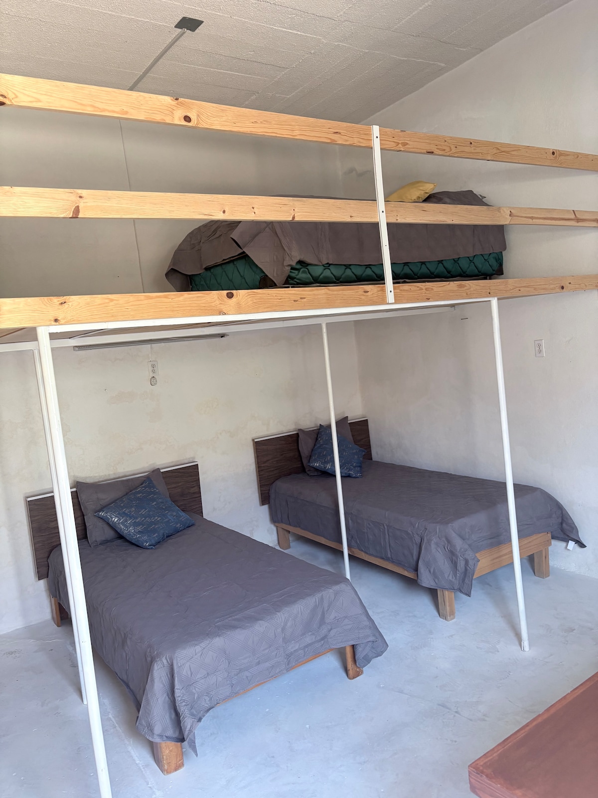 Rusztikus szoba 3 egyszemélyes ággyal (1 a galérián, amelybe létrán lehet feljutni). A szobához egy rusztikus fürdőszoba tartozik zuhanyzóval, amely a szabadban, az udvaron túl található. A fürdőszobát csak a szobában megszálló vendégek használják közösen. Kábeltévé és Wi-Fi is van, parkolás. 3 percre vagyunk a Vito gyógyfürdőtől, és közvetlenül a Cemex Atotonilco mögött találhatóunk. (A vonat a szállás mögött halad el.)