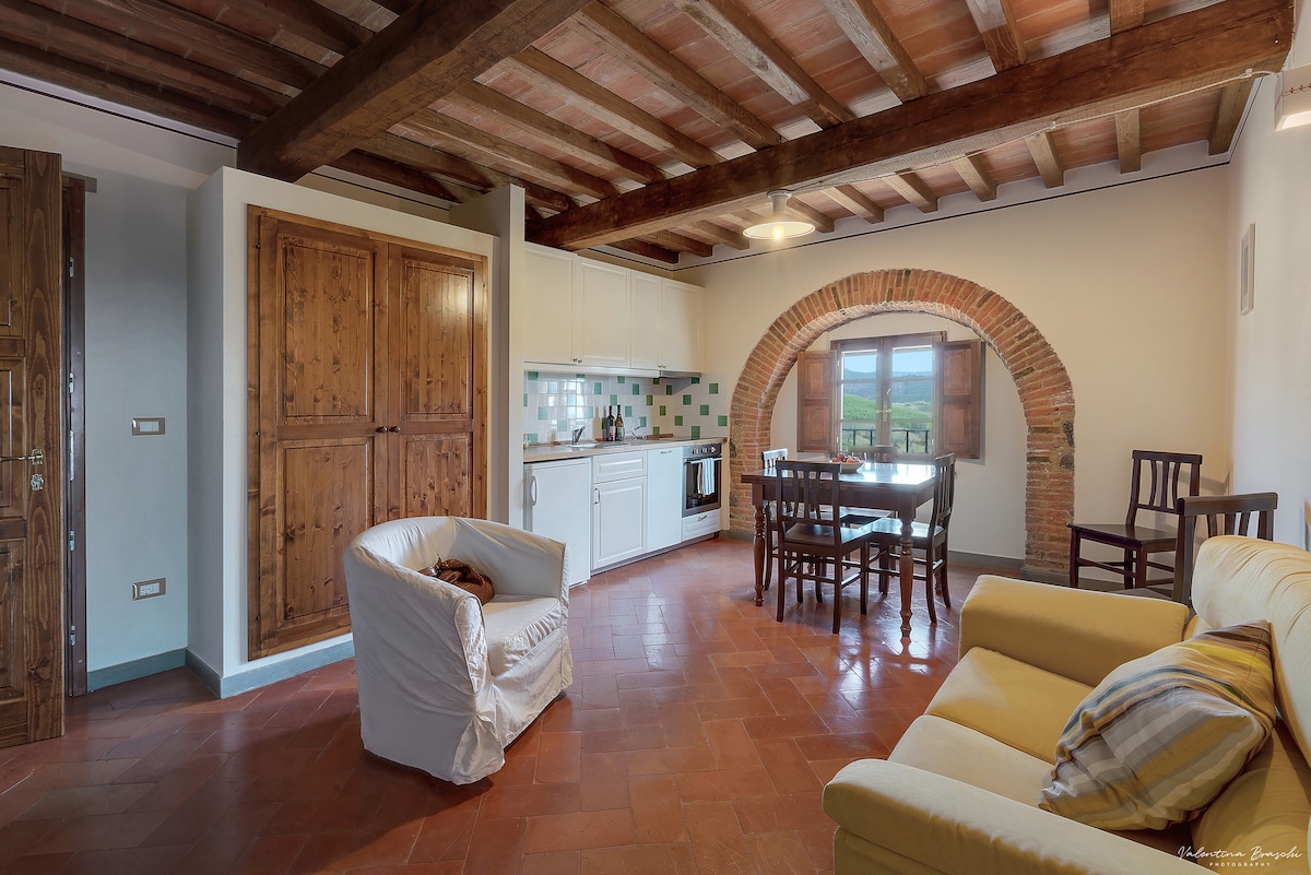 Történelmi lakás, az első emeleten található, terasszal és saját kerttel Riparbella falu központjában. Lakható konyhából áll, gyönyörű panorámával, nagy étkező kandallóval és kétszemélyes kanapéval, kétágyas hálószoba, hálószoba és fürdőszoba. Elmerül a természetben, a dombokon és néhány kilométerre a tengertől, és ideális helyzetben van az olyan művészeti városok eléréséhez, mint Pisa, Firenze, Siena, Volterra és San Gimignano.
