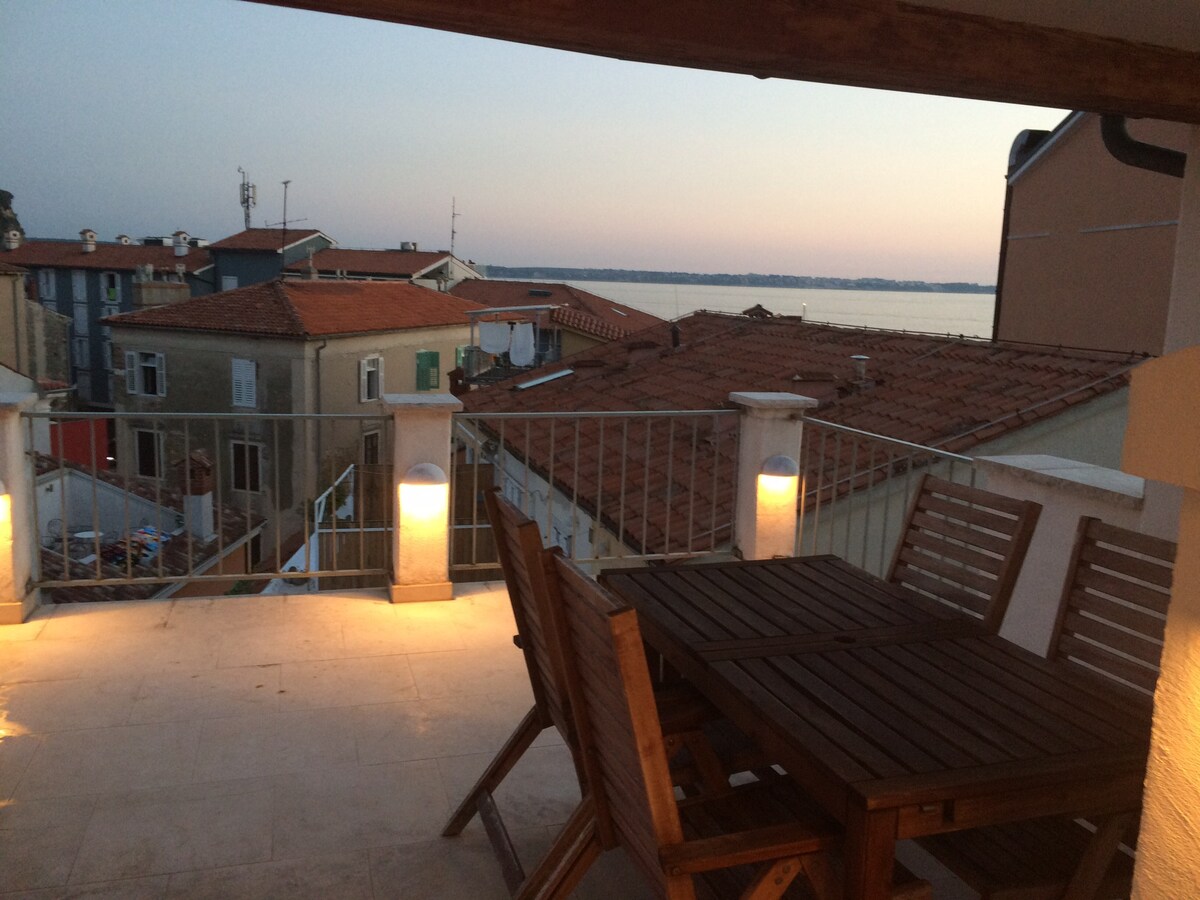 Piran, bájos lakás : nagyszerű terasz a tengeren !