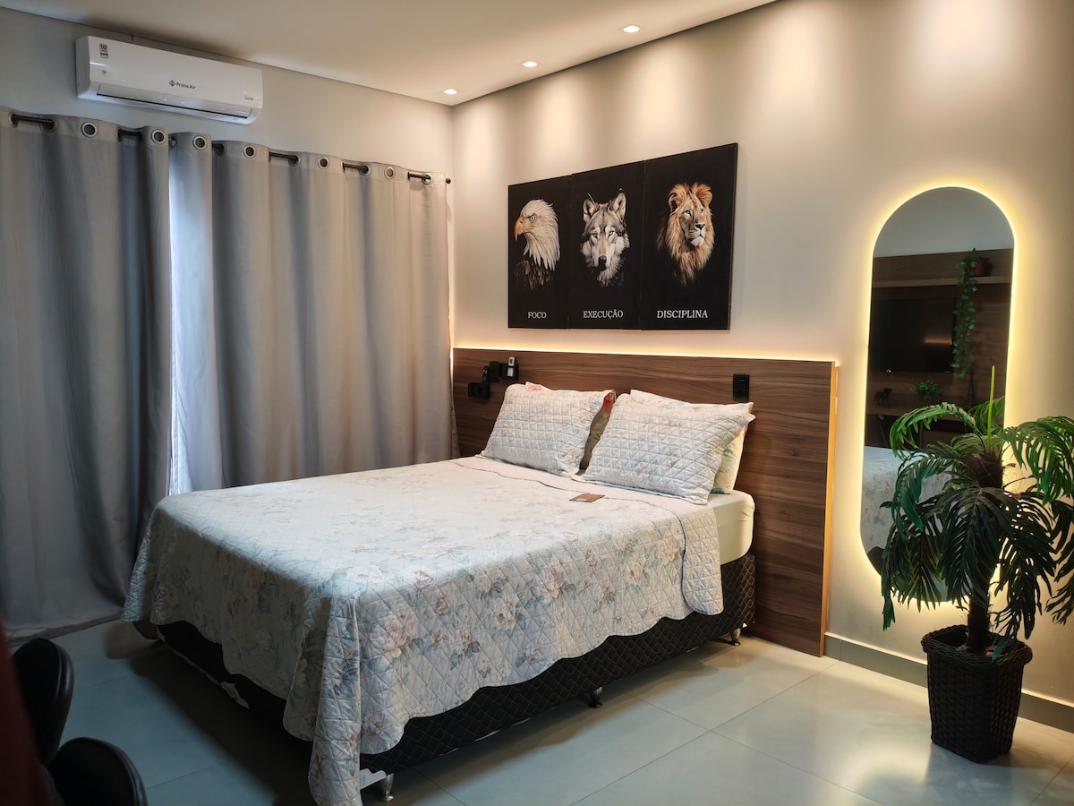 Ambiente totalmente Privado, e Bem equipado, com cozinha, banheiro e quarto, tudo muito limpo e Agradável, com garagem coberta para carro de até 5 metros. a 7Km do Centro. Nosso Estúdio irá te proporcionar uma Ótima experiência. A 13 minutos do Centro, e contamos com varios pontos comerciais próximos, a menos de 2 minutos de carro, Mercado, Academia, Pizzaria , restaurante, posto de gasolina, Farmacia. Ideal para suas férias ou diárias rápidas pela cidade, com segurança e tranquilidade.
