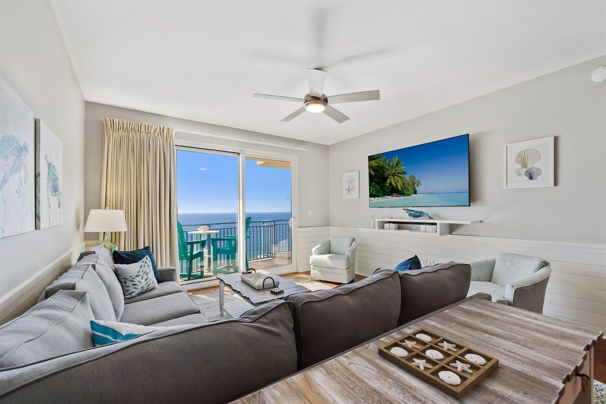 This 7th-floor corner unit condo at Tidewater Beach Resort offers breathtaking panoramic views of the endless shoreline of the emerald Gulf Coast. From the private balcony or the comfort of the living room sofa or dining table, enjoy stunning sunsets over the ocean and dazzling city lights at night. Resort boasts incredible amenities, including two lagoon-style pools, a heated indoor pool, hot tubs, a state-of-the-art fitness center with a Roman spa, a movie theater, and private beach access.