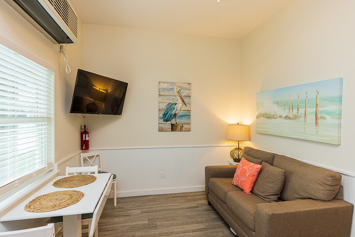 Experience a serene getaway in this newly remodeled, first floor studio on North Padre Island only a short 5 minute walk to the beach. This cozy cottage features a timeless and beautiful design, including a king size bed and queen sleeper sofa accommodating up to 4 guests. You will also enjoy a full kitchen, bathroom, dining and living area with 4K TV. There are many shared condominium amenities to include pool, hot tub, sauna, gym, bbq and more. Enjoy a serene beach getaway today!