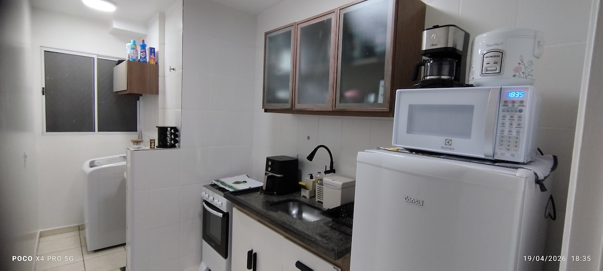Seja bem-vindo(a) Cond. portaria 24h, apartamento, no 1° andar, Conforto e Praticidade, estadia tranquila. estacionamento, piscina com agua aquecida. 2 dormitório, 2 camas, 1 casal e 1 solteiro, sala com tv, cozinha completa, fogão, geladeira, microondas, maquina lava roupas, sanduicheira, cafeteira, Air fryer, panela arroz, liquidificador, chaleira eletrica. ferro de passar. 2 smart tvs. com streaming, internet fibra 600mg, ventilador de teto com controle remoto em todos os cômodos.