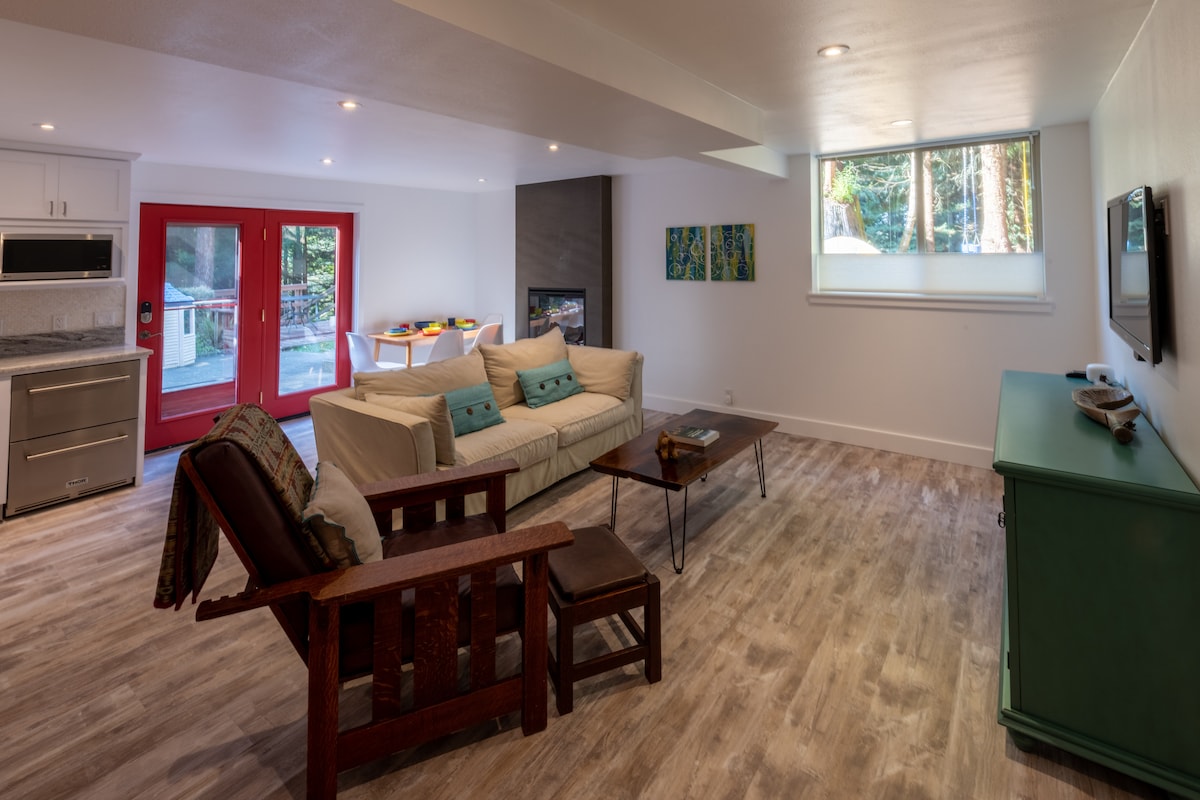 Tölts időt a mamutfenyők között a halastó közelében, elegáns, modern menedékünkben, ahol számos művészi egyedi elem található. Hagyd, hogy az útról érkező feszültség elolvadjon a pezsgőfürdőnkben és a gyógyfürdőnkben, mint az esőzuhany, majd pihenj a kényelmes California King ágyainkon. Az Arcata feletti dombokon, egy előkelő, csendes környéken található, kiterjedt mamutfenyő túraútvonalak közelében. Lazíts a védett kültéri nappalinkban, ahol tűzrakóhely van a tónál. **Kérjük, a szomszédok érdekében ne beszéljetek hangosan.**